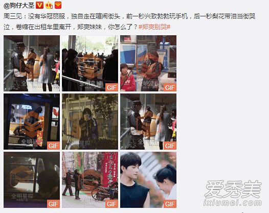 1月18日早9点,狗仔大圣在微博中爆料“没有华冠丽服,独自走在喧闹街头,前一秒兴致勃勃玩手机,后一秒梨花带泪当街哭泣,卷缩在出租车里离开,郑爽妹妹,你怎么了?”,并且还带了一组gif图片,疑似指明得抑郁症的当红小花就是郑爽!