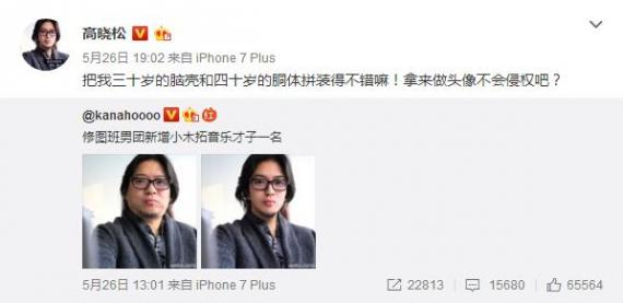 5月26日,网友通过微博上传美图前后的高晓松对比照,并称:“修图班男团新增小木拓音乐才子一名 。”照片中,修图过后的高晓松不管是脸型和身材都比高晓松半人帅气精神,十足的美男子一枚。稍后,在同一天,高晓松转发此微博并称:“把我三十岁的脑壳和四十岁的胴体拼装得不错嘛!拿来做头像不会侵权吧