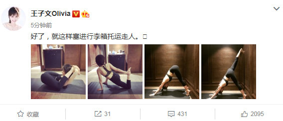 早前(7月8日),王子文曾晒出自己在房间里做瑜伽的照片,其中一个全身“对折”的动作简直可怕!当时,王子文也调侃自己,在配文中说:“好了,就这样塞进行李箱托运走人。”粉丝也回复:“等着,我提着箱子赶来了。”