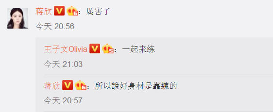 王子文发微博后,蒋欣赞叹:“厉害了!”而王子文也号召好闺蜜来跟着自己一起练习,蒋欣羡慕的说:“所以说好身材是靠练的。”