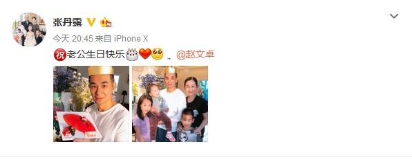 10日,赵文卓妻子张丹露晒出全家福,并配文:“祝老公生日快乐。”照片中,赵文卓站在中间,怀里抱着小女儿,小女儿看着镜头外笑的非常开心,大女儿则靠在爸爸身边,腼腆漂亮。妻子张丹露则紧紧倚在赵文卓旁边,双手搭在儿子肩上,笑的十分幸福。