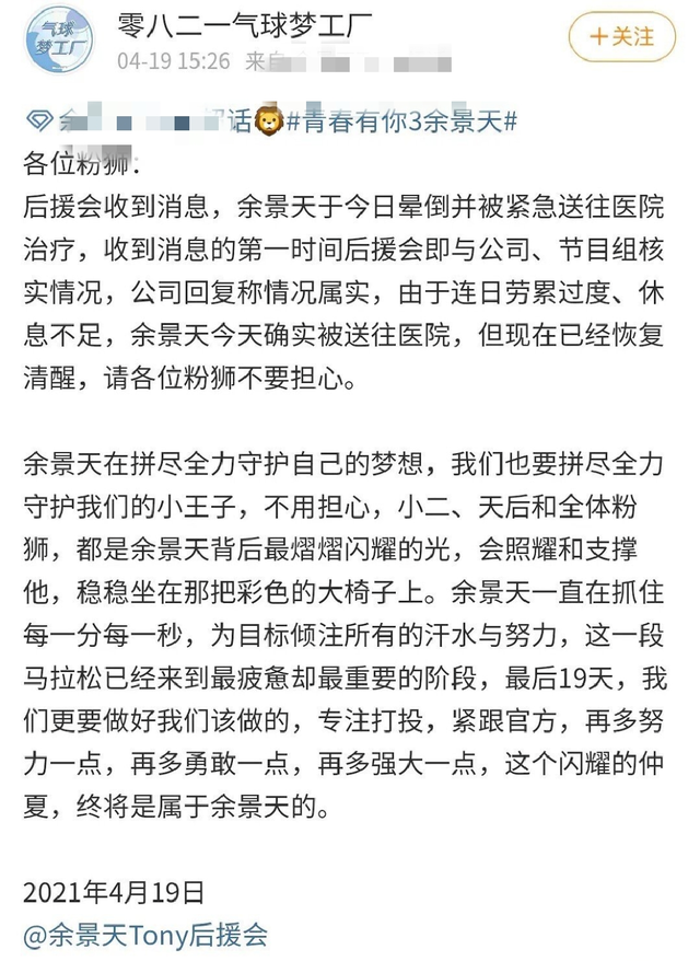 余景天在《青春有你3》中深受粉丝喜爱,而且排名也非常靠前,他本人也没有辜负这份期待,训练十分努力,还曾因为训练过于劳累晕倒,还在采访中自曝一天只睡了一个半小时。当时余景天粉丝团连忙发声明,表达了粉丝们对偶像的心疼,并呼吁粉丝们尽自己一份力,多多打投,帮助余景天出道。