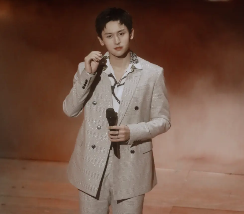 由于他节目比较多,紧接着又换了一身装扮,一套亮闪闪的银色格子西装、内搭一件印花衬衫,没有佩戴多余的女性化首饰,这个打扮就正常多了,但还是得感慨一句他的造型师真用心啊。