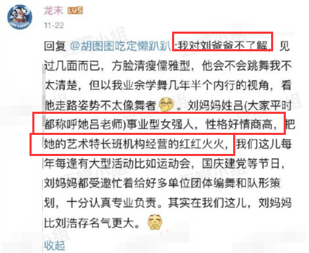 刘浩存出道以来很少提及家里人,关于父母消息网友一概不知。直到去年11月份有人透露刘浩存妈妈姓吕,经营一家舞蹈培训班,大家才把二者联系到一起。